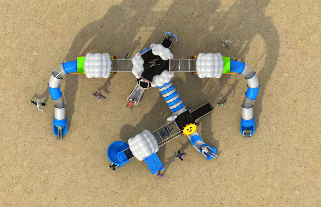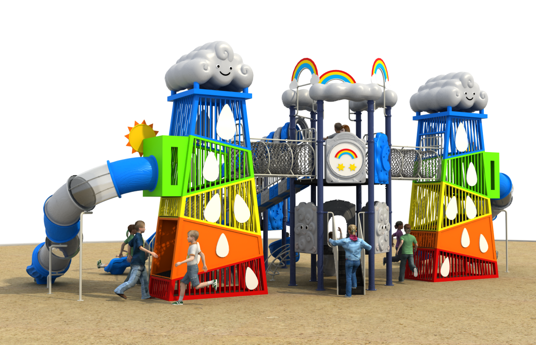 产品介绍:软绵绵的云朵在天空中游荡,阳光折射出的彩虹也在云朵边躲藏,晴天是最适合玩耍的日子。孩子们闯进天空上,躲在云朵下享受自然的馈赠。云朵系列,以云朵为设计主题,彩虹为点缀,蓝灰色为主色调,将云朵和滑梯结合,让孩子们在蓝天白云下快乐玩耍。