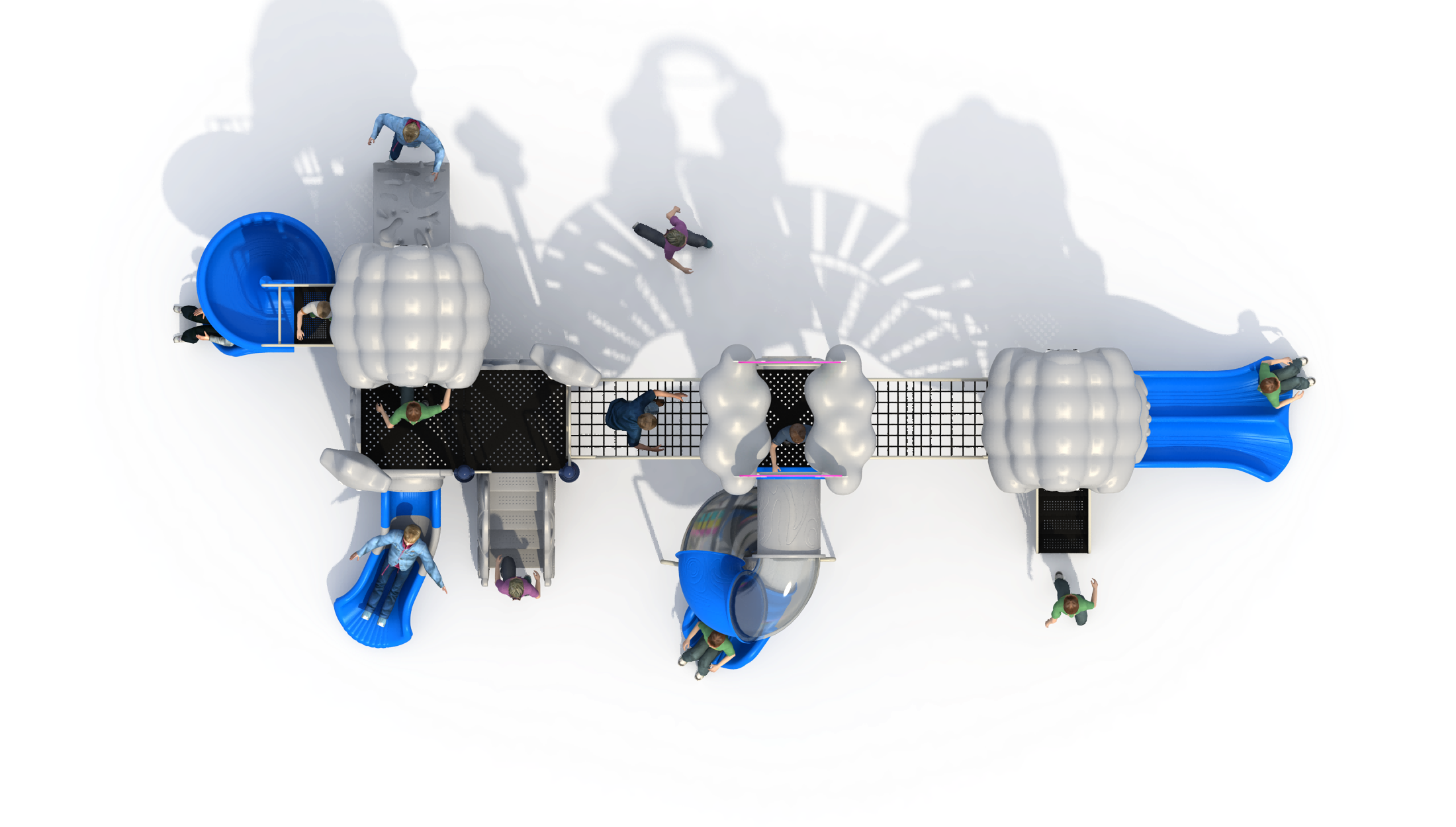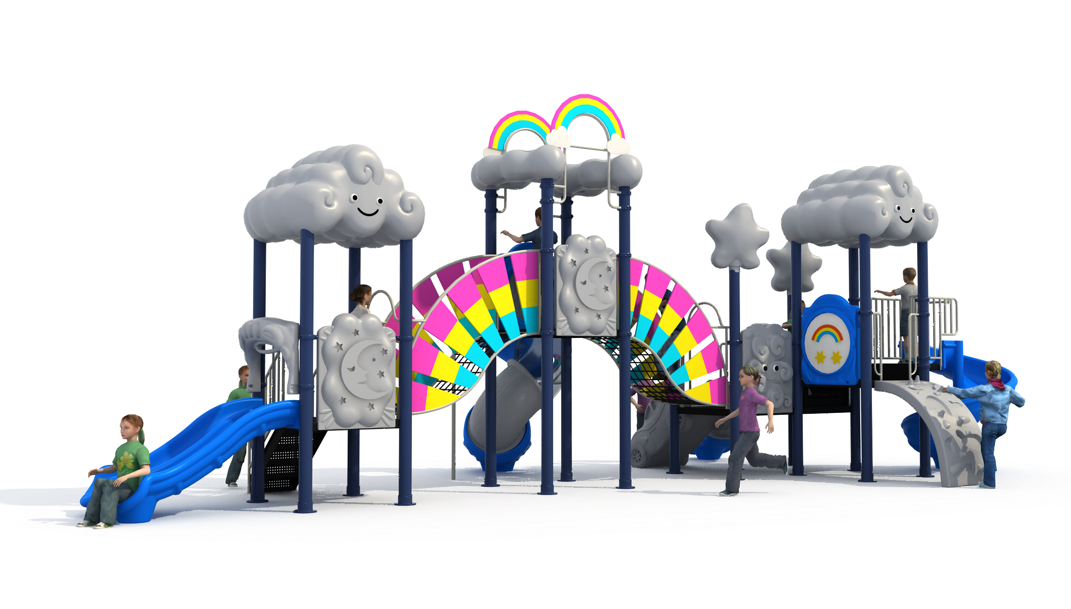 产品介绍:软绵绵的云朵在天空中游荡,阳光折射出的彩虹也在云朵边躲藏,晴天是最适合玩耍的日子。孩子们闯进天空上,躲在云朵下享受自然的馈赠。云朵系列,以云朵为设计主题,彩虹为点缀,蓝灰色为主色调,将云朵和滑梯结合,让孩子们在蓝天白云下快乐玩耍。