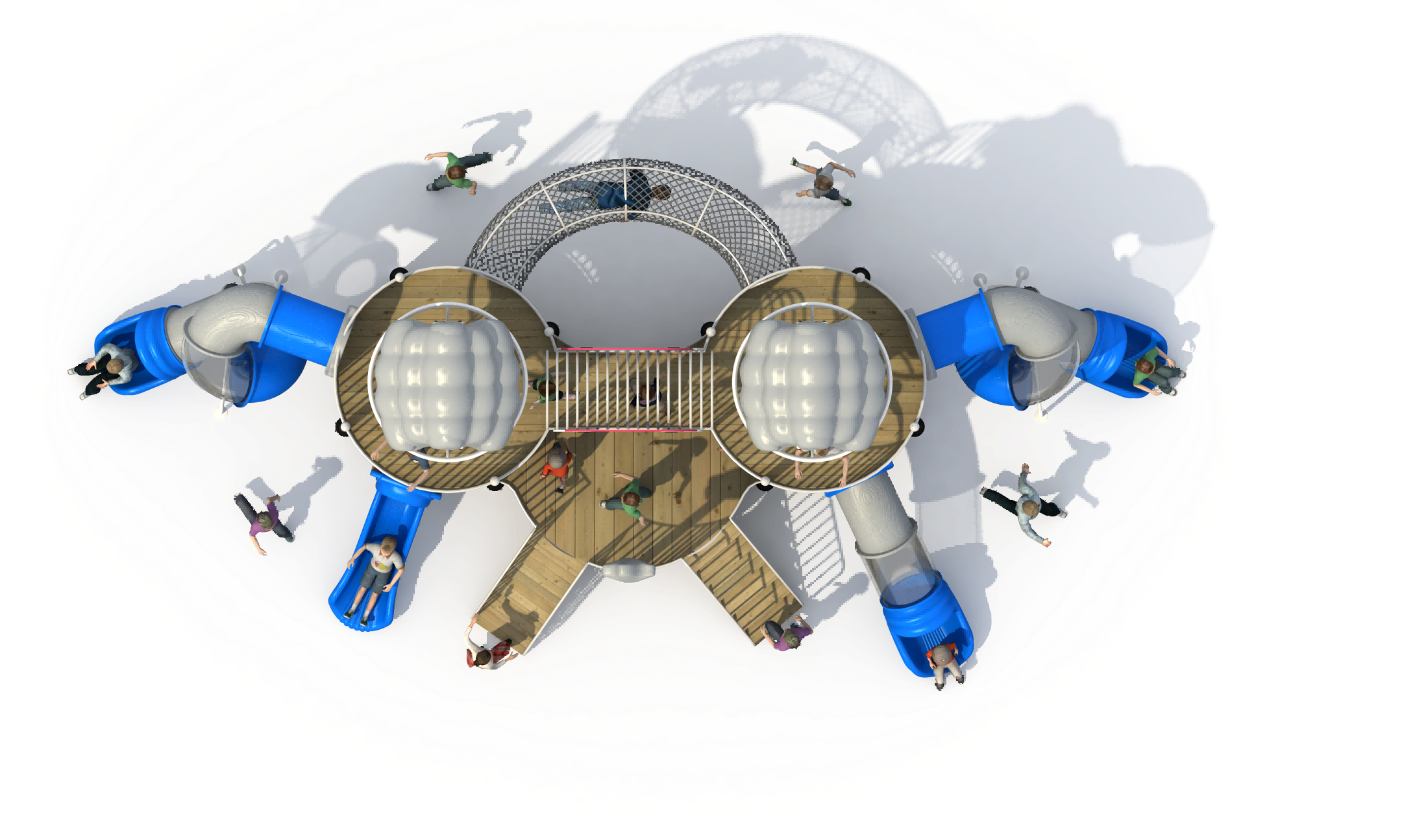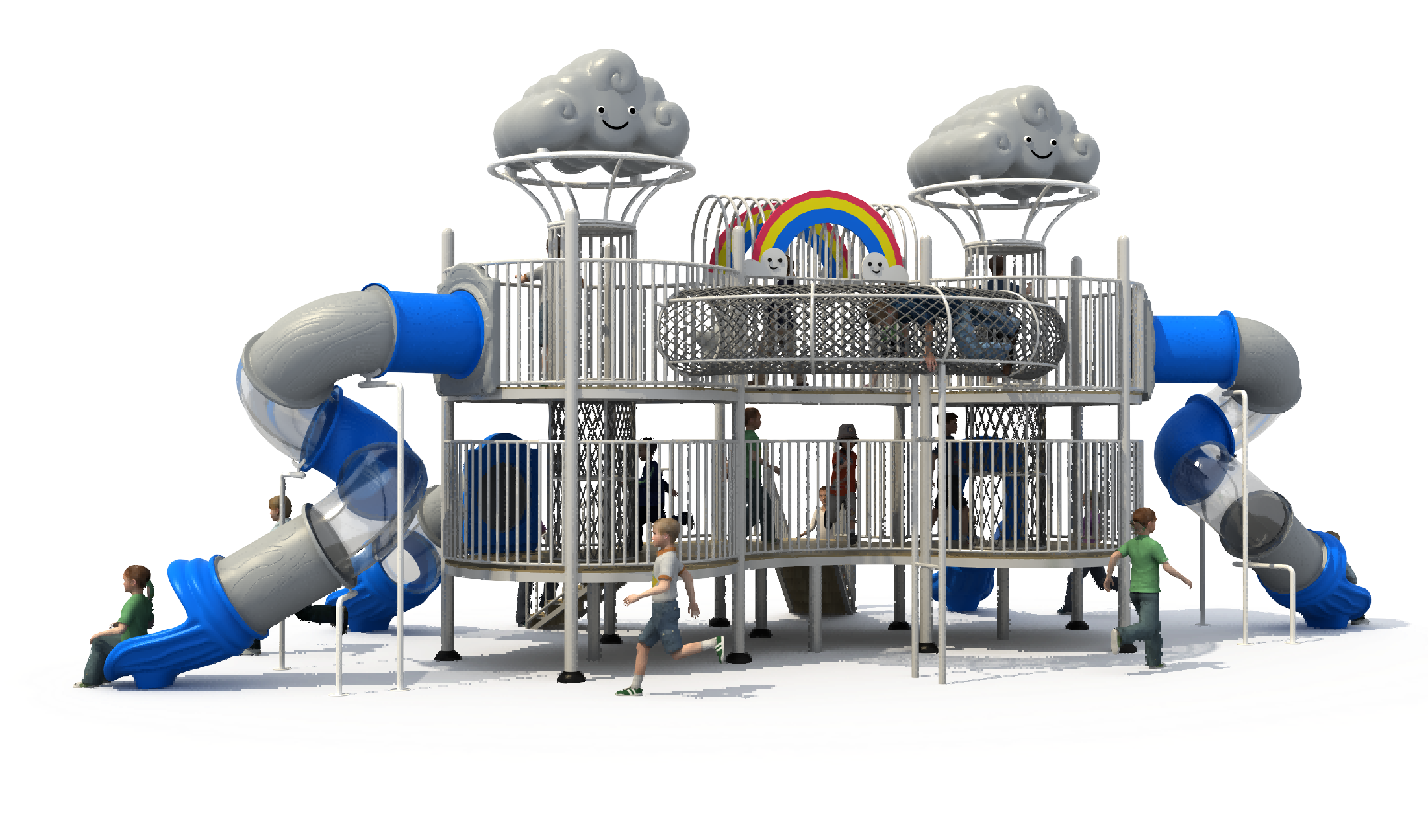 产品介绍:软绵绵的云朵在天空中游荡,阳光折射出的彩虹也在云朵边躲藏,晴天是最适合玩耍的日子。孩子们闯进天空上,躲在云朵下享受自然的馈赠。云朵系列,以云朵为设计主题,彩虹为点缀,蓝灰色为主色调,将云朵和滑梯结合,让孩子们在蓝天白云下快乐玩耍。