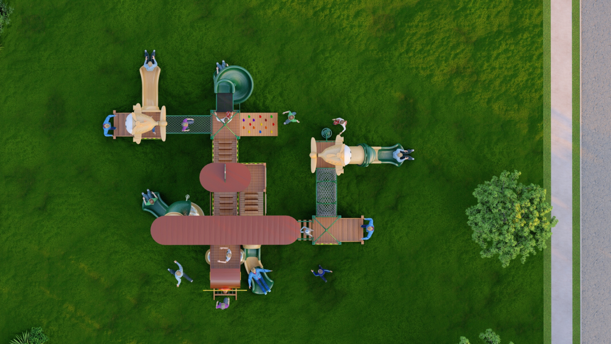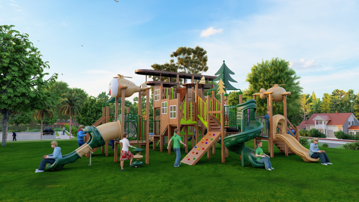 产品介绍:在蒸蒸日上游乐的梦幻王国中,一款直升机造型的木质滑梯正引领着孩子们飞向欢乐的新高度!这款滑梯以绿色和棕色为主色调,顶部装饰着精致的木制螺旋桨,仿佛一架即将起飞的直升机,等待着勇敢的小飞行员们踏上探险之旅。