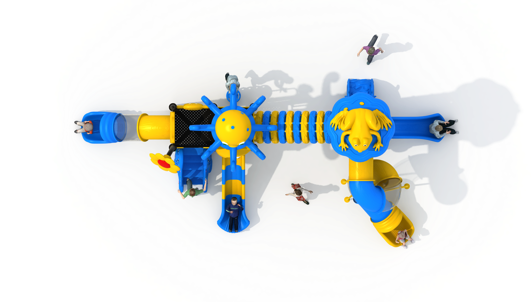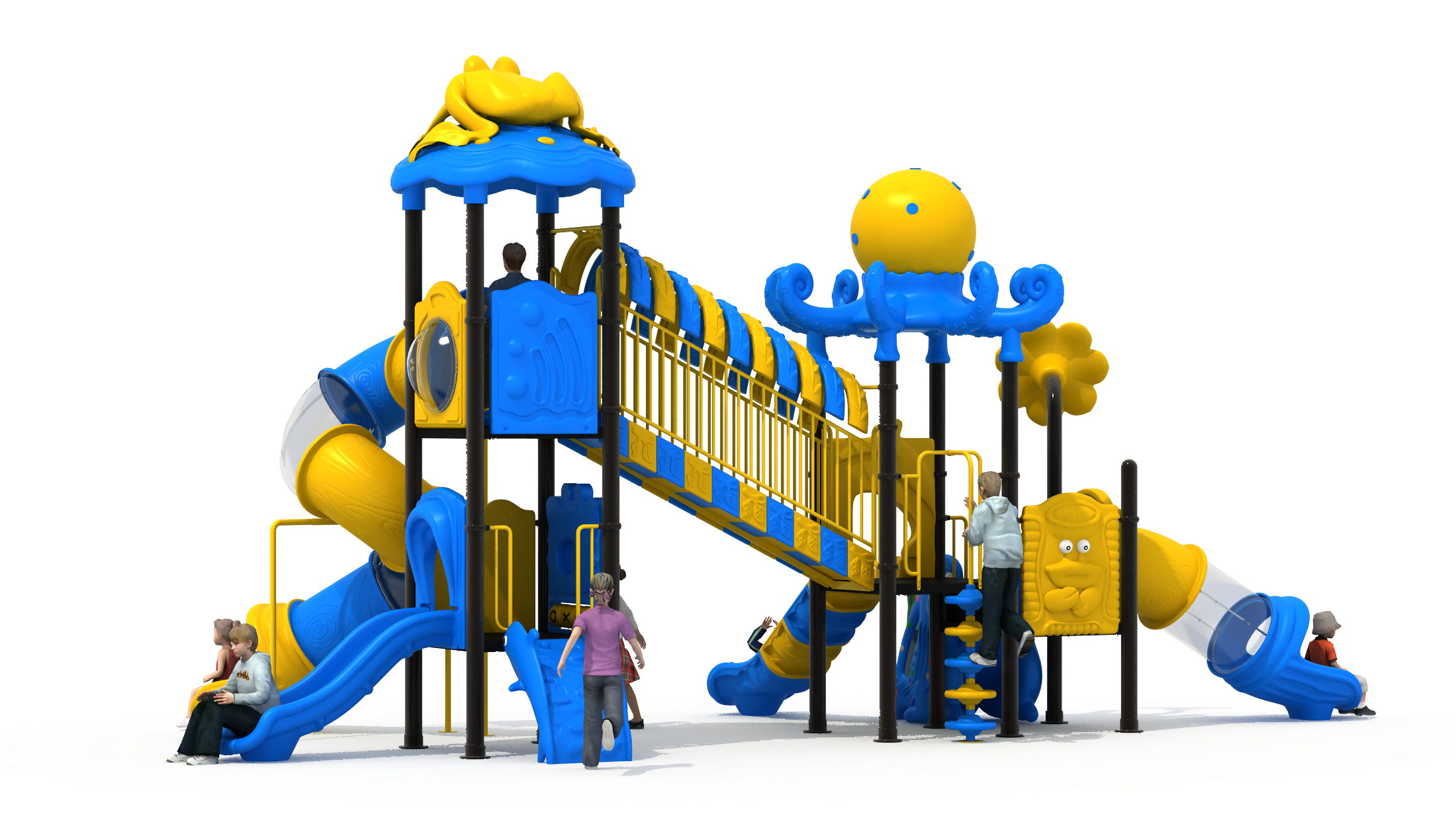 产品介绍:聒噪的青蛙、勤劳的蜜蜂、慢吞吞的蜗牛、温驯的绵羊还有呆楞的章鱼等可爱的动物们都聚集在一起。这里是动物们和孩子们共同玩耍的天堂。动物系列以不同动物作为设计主题,花朵绿叶作为设计点缀,以鲜艳的色调迅速吸引孩子们的目光,让孩子们在动物滑梯上享受运动的乐趣。